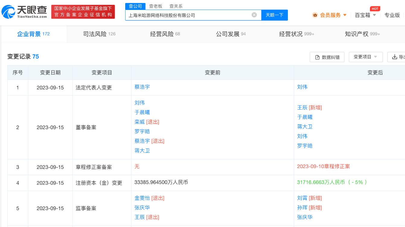 天眼查App显示,近日,上海米哈游网络科技股份有限公司发生工商变更,注册资本由约3.34亿人民币减至约3.17亿人民币,同时,米哈游联合创始人蔡浩宇卸任法定代表人、董事长,由另一位联合创始人刘伟接任。目前,蔡浩宇仍为该公司第一大股东。