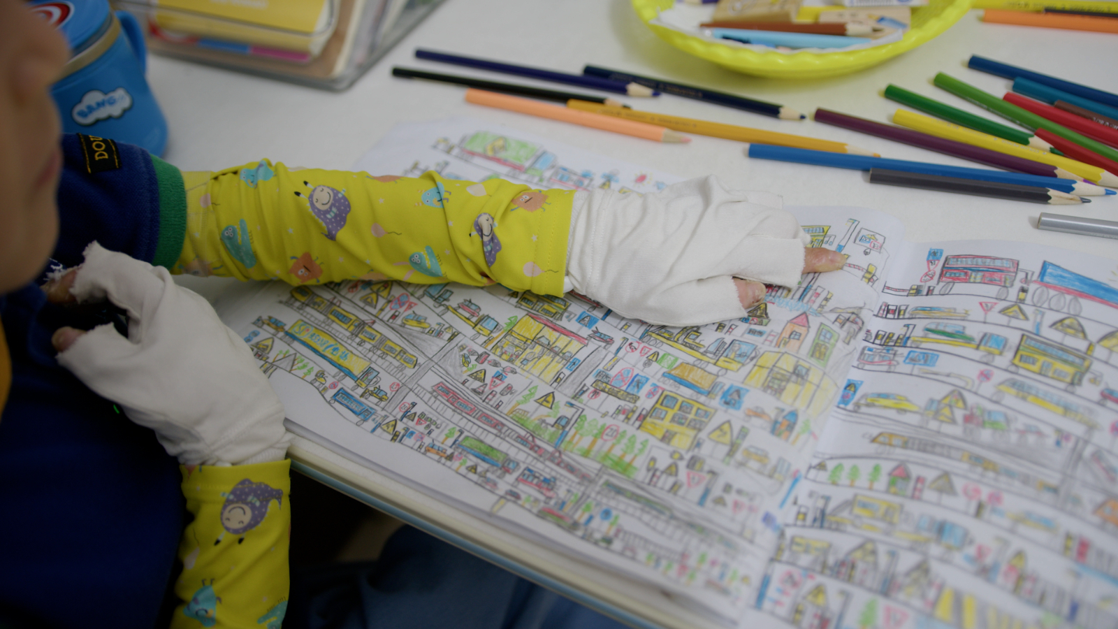 “这是路灯、这是快递车、这是医院……”麦赫迪非常喜欢画画,他翻开厚厚的画本,兴致勃勃地给大家介绍自己的作品。彩色的铅笔就像蝴蝶的色彩,帮助孩子的想象力生根,让生活里的一切跃然纸上。他说我不想哭,我要开开心心度过每一天。