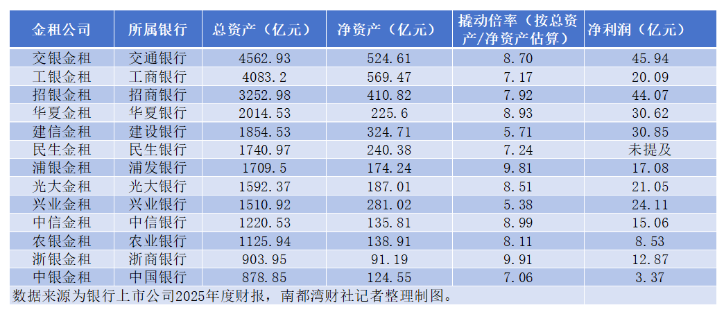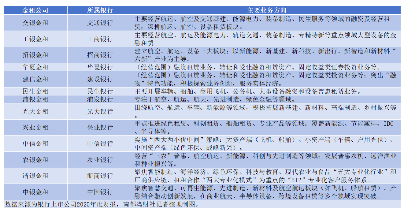 南都湾财社记者近日搜集6家国有大型银行与9家全国性股份制商业银行的2025年度财报并梳理发现,除国有行中的邮储银行、股份行中的平安银行目前暂未设立金租子公司外,其余13家银行均已将金租子公司纳入并表范围。