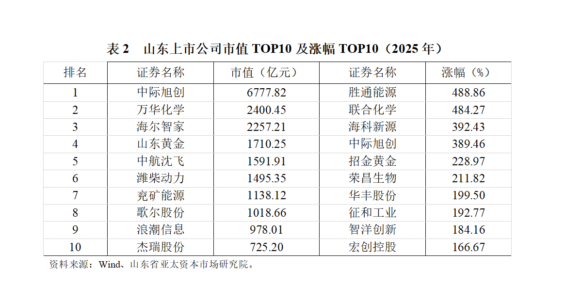 2025年,上证综指、深证成指、创业板指和北证50等主要指数显著上涨,股票市场赚钱效应全面激活,市场流动性增强,投资者参与度提高,A股整体成交量大幅提升。年内股票市场行业板块呈现结构性牛市特征,省域板块结构性特征同样明显。根据Wind省级指数,2025年共有15个省级板块指数涨幅跑赢万得全A指数(27.65%)。山东板块指数涨幅达44.25%,仅次于青海板块和福建板块,居全国第3,涨幅位居全国前列。从板块成交量看,全国共有7省市股票成交量突破1万亿股,山东板块成交1.36万亿股,位居全国第6。从板块成交额看,全国共有11省市板块成交额突破10万亿元,山东板块成交金额为19.13万亿元,同样位居全国第6。山东上市公司中,成交量最高的是南山铝业(600219.SH),全年成交419.03亿股;成交金额最高的是中际旭创(300308.SZ),全年成交2.52万亿元,也是全省唯一成交金额超万亿元的上市公司(见表1)。