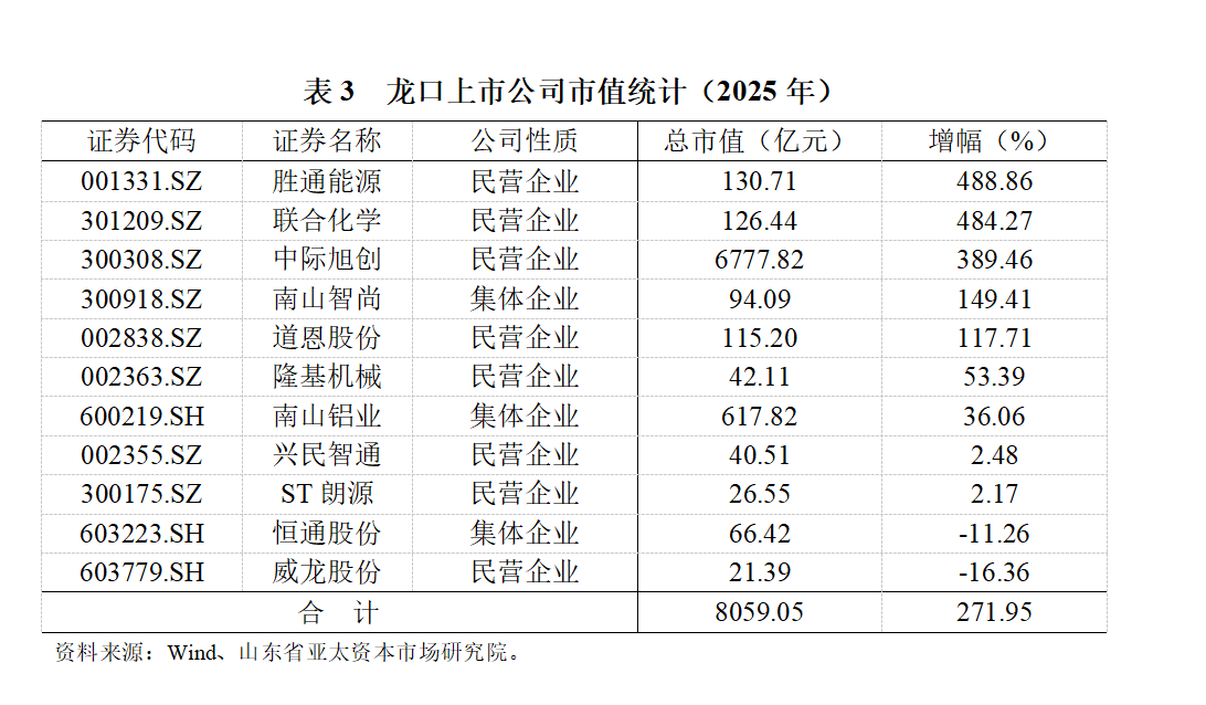 在资本市场助力和民营企业向“新”发展背景下,民营上市公司韧性与活力将持续释放。2025年2月,山东省委办公厅、省政府办公厅印发《关于进一步加快县域经济高质量发展的意见》[],进一步加快山东省县域经济高质量发展,推动塑造经济社会发展新优势。得益于民营经济和县域经济政策支持,山东县域县实力持续提升。作为北方县域第一城,龙口上市公司放眼全球先进制造技术产业发展趋势,在数字化、智能化、绿色化浪潮驱动下,主动谋划转型,积极拥抱新质生产力。中际旭创(300308.SZ)由电机设备制造转化为光模块巨头,胜通能源(001331.SZ)牵手七腾机器人,联合化学(301209.SZ)切入半导体赛道,隆基机械(002363.SZ)从汽车制动进入商业航天领域,道恩股份(002838.SZ)从熔喷料转向高性能材料,南山智尚(300918.SZ)和南山铝业(600219.SH)占据各自赛道制高点。这些上市公司的成功转型,为龙口资本市场高质量发展奠定基础。截至2025年末,龙口11家上市公司市值为8059.05亿元,占全省上市公司总市值的16.41%,市值仅次于青岛,市值同比增长271.95%(见表3),远超各城市上市公司市值涨幅。