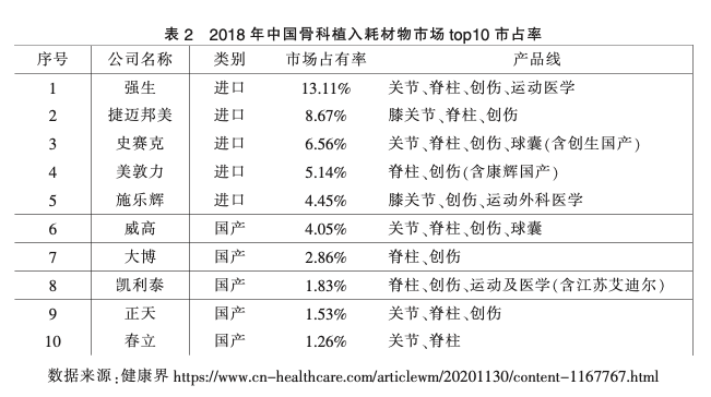2018年的数据显示,头部的几家跨国公司,就占据了全国37.93%份额。其中,强生占13.11%、捷迈邦美8.67%、史赛克6.56%、美敦力5.14%、施乐辉4.45%。