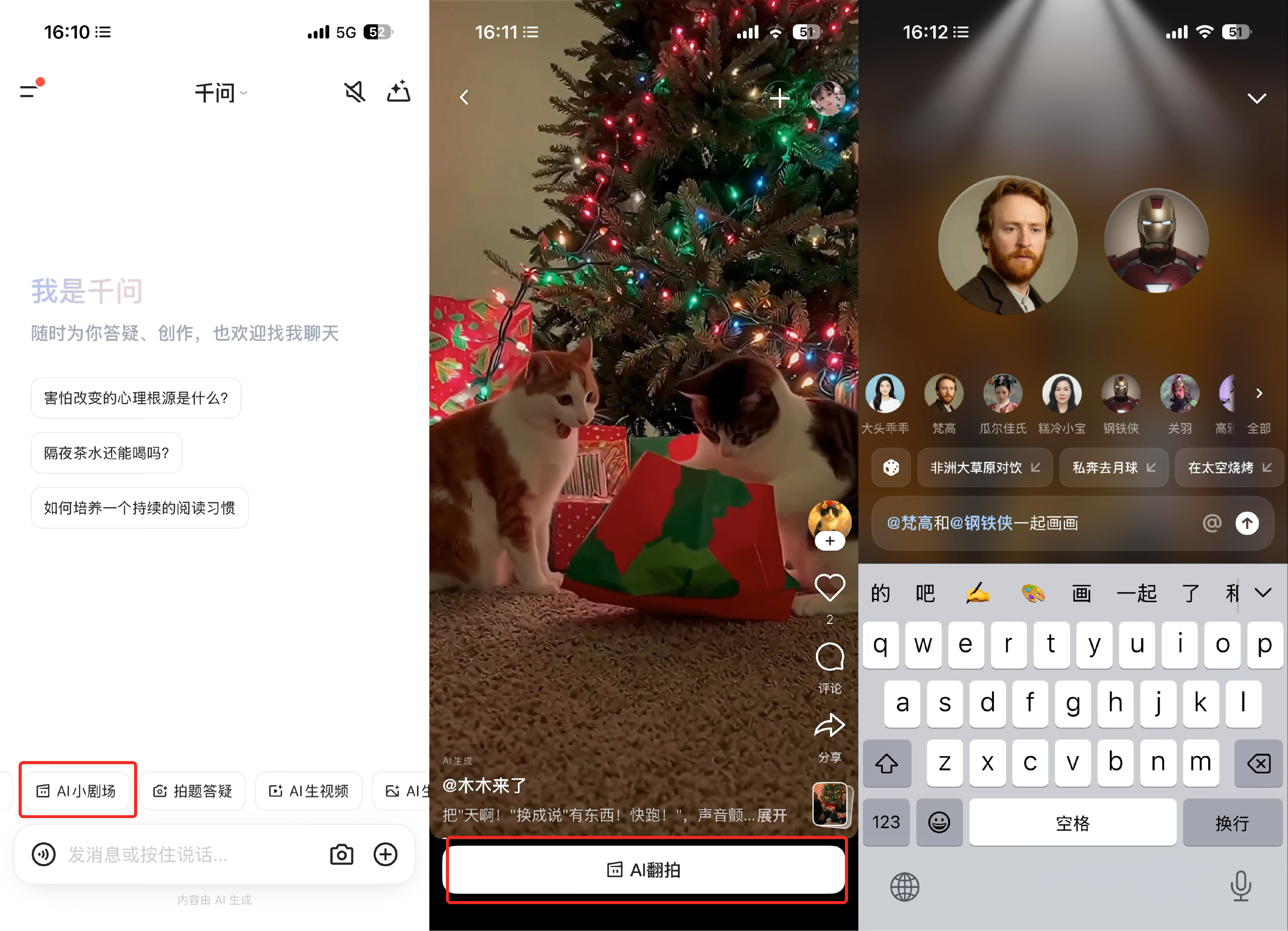12月16日,阿里千问APP同步上线最新视频生成模型万相2.6,并向所有用户免费开放。基于该模型的核心能力,千问APP上线“AI小剧场”功能,在国内首次实现“角色合拍”玩法,用户可与朋友或名人轻松同框出演AI短片。
