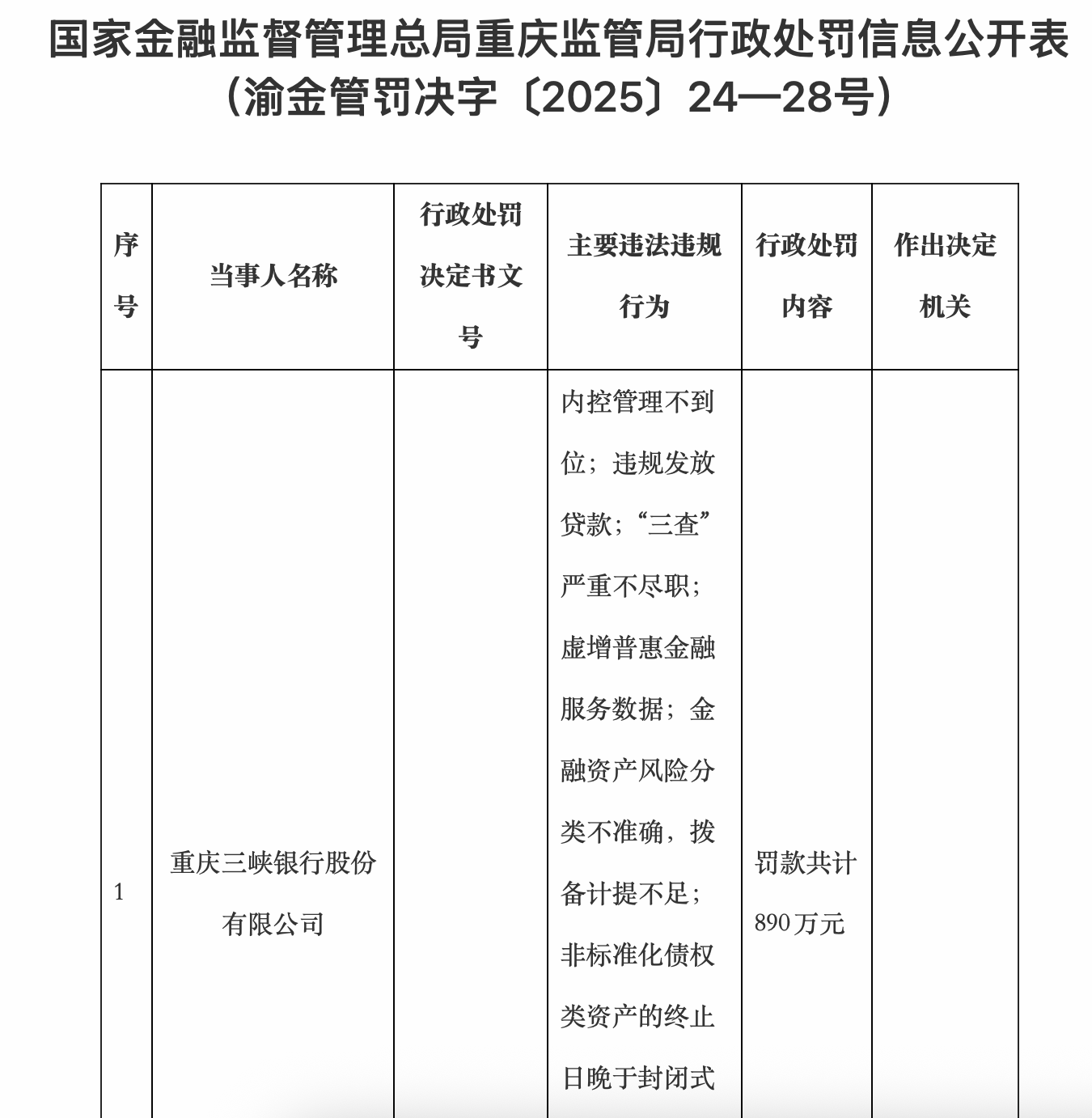 重庆三峡银行此次被罚890万元,系因国家金融监督管理总局重庆监管局认定其存在八项明确违法违规行为。具体包括:(1)内部控制管理不到位;(2)违规发放贷款;(3)“三查”(贷前调查、贷中审查、贷后检查)严重不尽职;(4)虚增普惠金融服务相关数据;(5)金融资产风险分类不准确,导致拨备计提不足;(6)非标准化债权类资产的终止日晚于封闭式理财产品的到期日;(7)授信管理不尽职;(8)员工行为管理不到位。上述问题覆盖公司治理、信贷全流程、数据报送、资产管理及人员管理等核心领域,反映出该行合规机制全面失灵。