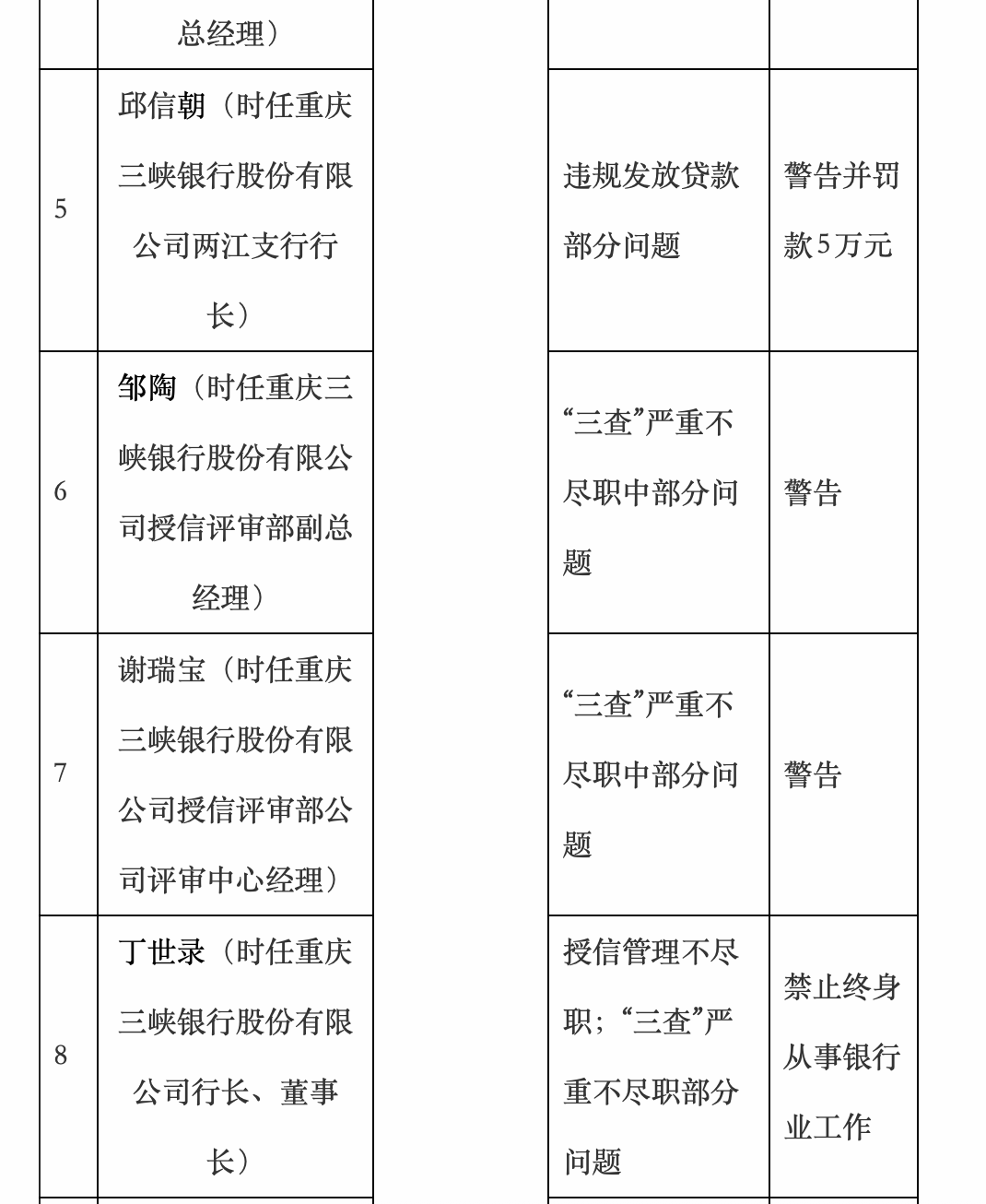 中层管理人员亦被精准问责。时任重庆三峡银行信贷管理部副总经理王身忠、时任重庆三峡银行授信评审部副总经理邹陶、时任重庆三峡银行授信评审部公司评审中心经理谢瑞宝均因在授信流程审核中存在不尽职行为,被认定对“授信管理不尽职中的部分问题”负有责任,分别被予以警告并处罚款。时任重庆三峡银行两江支行行长邱信朝作为分支机构负责人,直接组织贷款发放,在贷前调查与贷后检查环节严重失职,被认定对“‘三查’严重不尽职中的部分问题”负有责任,也被警告并处罚款。