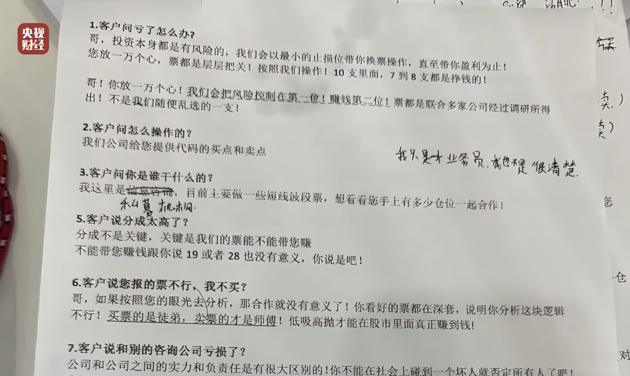 据央视报道,网络上有多家开展“荐股分成”业务的机构。其中一家自称“天顺投资”的荐股机构,推荐记者以18.82元/股的价格买入某只股票2000股,半个月内该股票价格持续下跌,记者亏损8个点后割肉离场。记者与该机构客服视频通话时发现,客服背后墙面显示“鑫犇科信息咨询有限公司”字样。