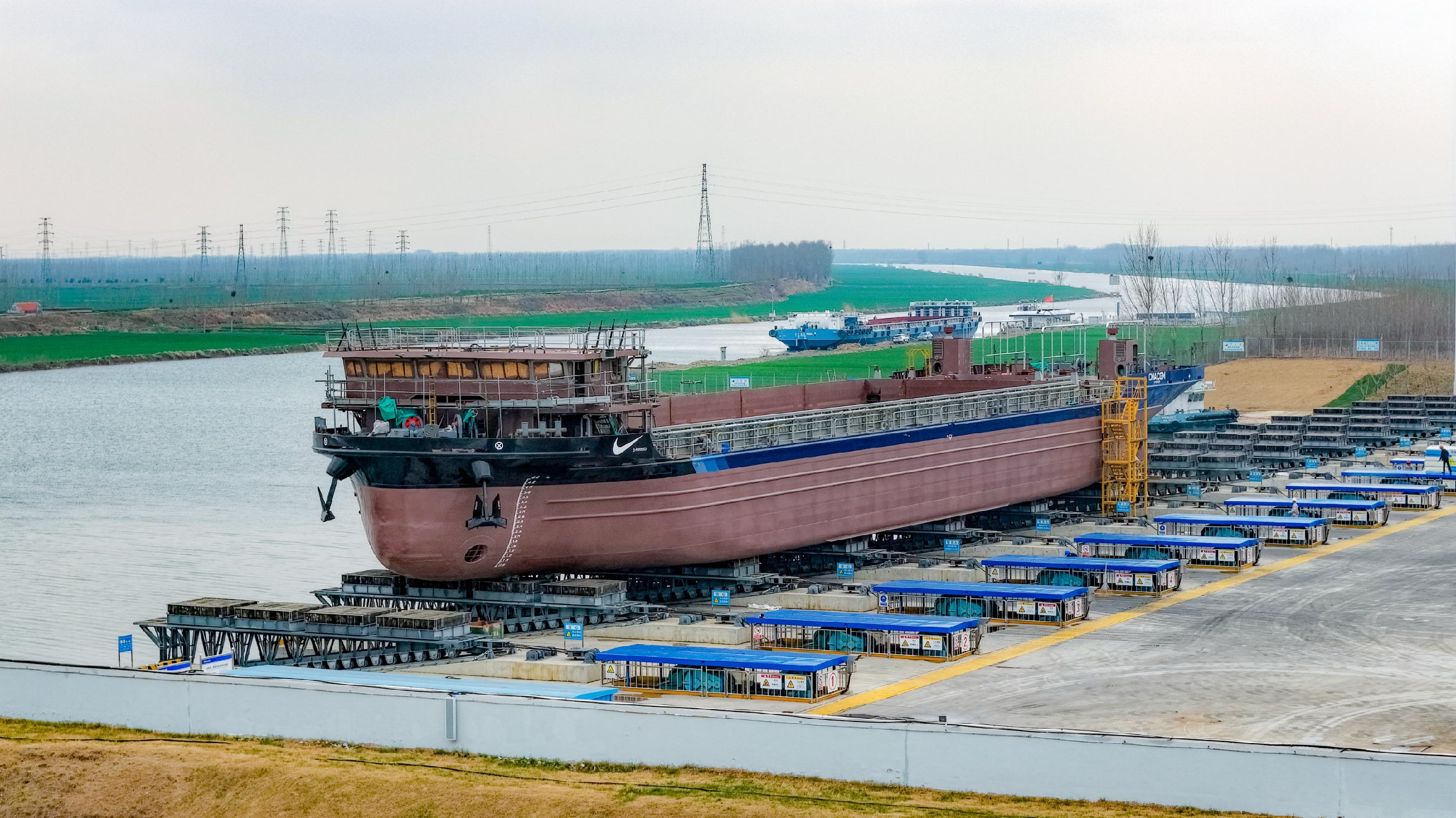 3月19日,在山东济宁京杭大运河畔,一艘纯电动力集装箱船缓缓滑入水面。船长79.9米,载重3500吨,搭载着4个1959千瓦时的集装箱式电池。