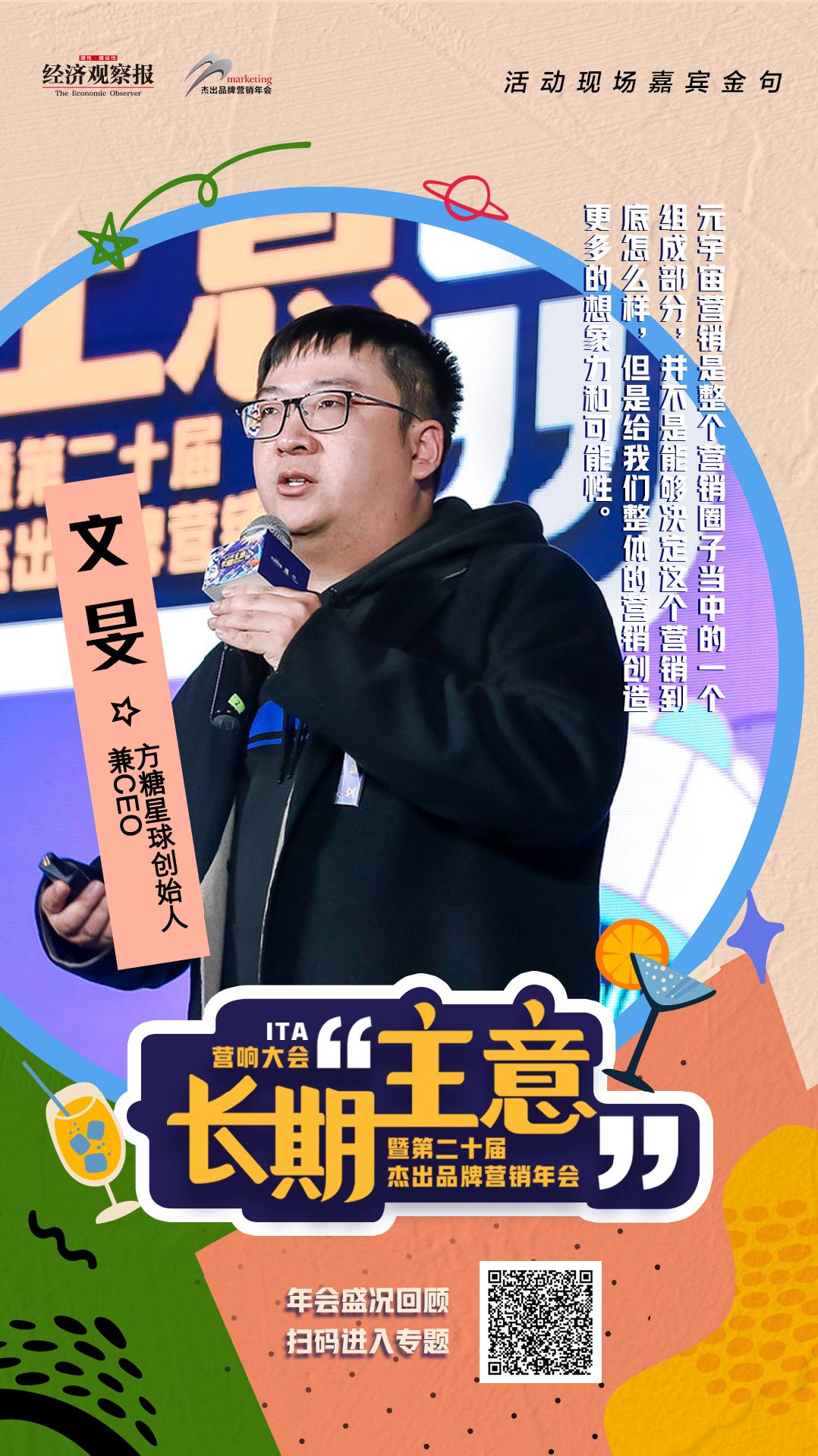 【文旻:元宇宙营销给我们整体的营销创造更多的想象力和可能性】由《经济观察报》举办的长期“主意”——ITA营响大会暨第二十届杰出品牌营销年会已圆满落幕, 方糖星球创始人兼CEO文旻在《创造你的虚拟世界:元宇宙营销的实践与探索》主题演讲中表示:元宇宙营销是整个营销圈子当中的一个组成部分,并不是能够决定这个营销到底怎么样,但是给我们整体的营销创造更多的想象力和可能性。