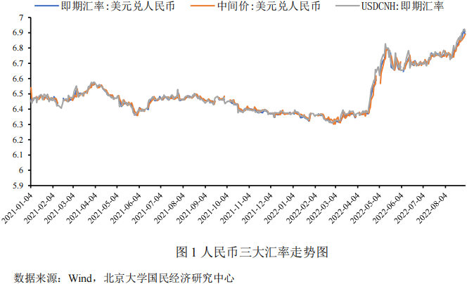 2022年8月,受到外资对人民币资产信心走弱、中美利差倒挂、美联储进一步加息缩表、国内经济基本面持续修复等因素影响,人民币汇率总体呈现在6.73-6.93区间内维持双向波动的态势。其中,人民币在岸汇率从6.7390跌至6.8905,累计下跌1515个基点;人民币中间价从6.7437调贬至6.8906,累计调贬1469个基点;人民币离岸汇率从6.7530跌至6.9069,累计下跌1539个基点。结合2021年以来三大人民币汇率走势图(如图1所示)可以发现,主要受美元指数走强和国内超预期降息的影响,8月份人民币汇率整体走弱,呈现在6.73-6.93区间内波动态势。8月中下旬起人民币走弱幅度增强,主要原因包括:8月5日央行超预期调降LPR利率,8月26日美联储主席鲍威尔在欧洲央行年会上发表讲话,表达抑制高通胀膨胀的坚定决心,美联储后续加息预期增强,叠加欧元疲软,美元指数强势保持强势,人民币贬值压力增大。