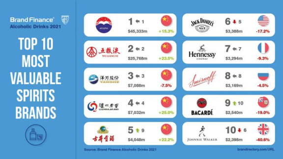 • 在Brand Finance全球烈酒品牌价值榜中,茅台雄霸第一。