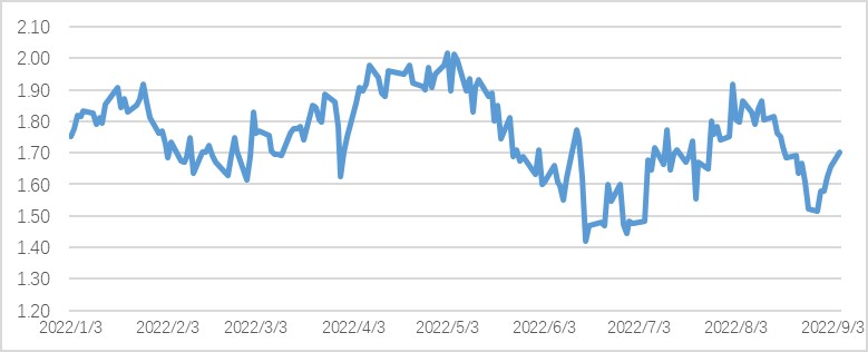 再次,地缘政治动荡持续带来了美国金融资产风险溢价相对处于低位,避险情绪推高了美元指数。美国近期加大了对乌克兰的军事援助,英国新任首相也表态要进一步支持乌克兰。强势美元压制了金价的上涨,但并未有效压制能源价格的上涨。截至9月8日上午9时,今年以来伦敦金现下跌6.2%;近期油价较大幅度下挫,但ICE布油价格今年以来还是上涨了13.5%。 俄乌地缘政治冲突尚不见好转,代理人战争使得美国相对于欧盟处于地理上的相对安全位置,避险情绪也是导致美元走强的一个因素。