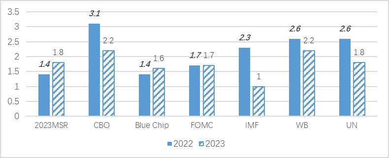 数据来源:MSR:美国白宫预测中期修正报告(2023 Mid-Session Review(June,2022)); CBO: 美国国会预算办公室(Congressional Budget Office economic Projection (May, 2022)); Blue Chip:蓝筹共识预测(Blue Chip Consensus Forecast (2022-2023)(June,2022)); FOMC:美联储6月经济预测计划;IMF:世界经济展望(WEO(July 2022));WB:全球经济展望(June,2022);UN:世界经济形势与展望(2022年中期)。