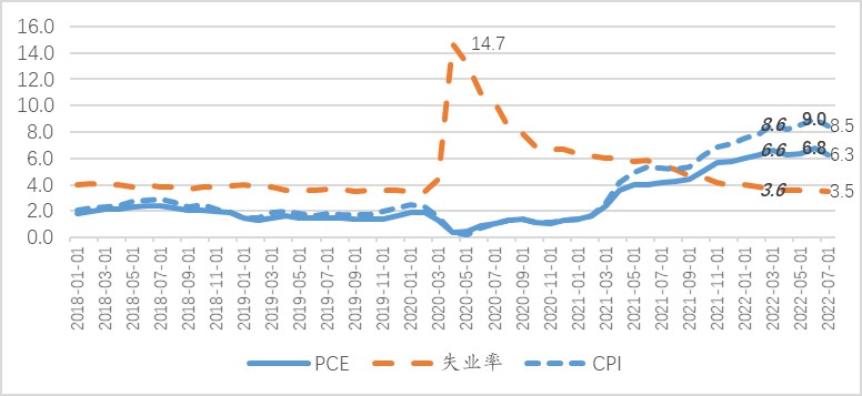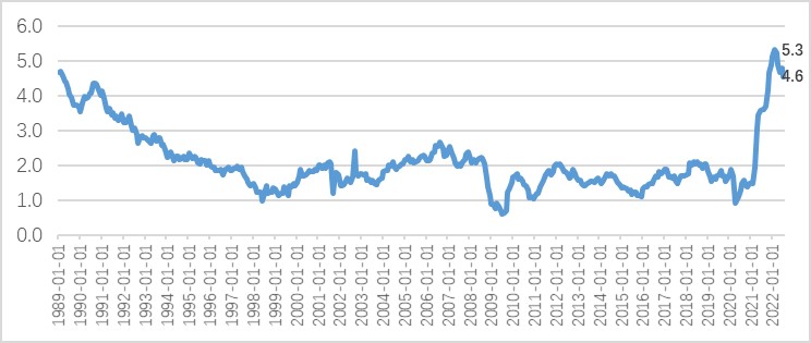 其次,美联储认为工资物价螺旋机制已经形成。7月份核心PCE同比4.6%,比今年2月份同比5.3%有所下降,但依然是33年以来的高位(图2)。核心PCE的上涨和持续说明了美国经济中工资物价螺旋机制已经形成,必须以增加失业率为代价来降低通胀。3.5%的失业率给了美联储进一步紧缩的底气,我们也许会看到在失业率超过4%之后,美国经济中的核心PCE才有可能出现较为明显的下降。