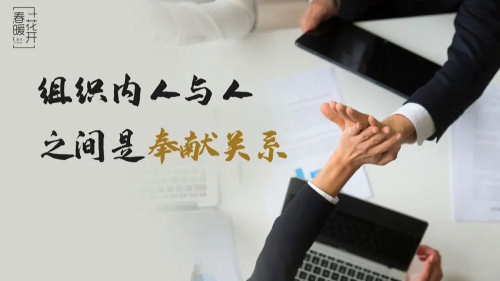 在今天谈奉献,有些人会觉得有点儿不合时宜,但是,我认为,我们要把组织内的关系理解为奉献关系,如果没有奉献作为基础,组织关系是不成立的。在组织中,人与人之间是相互付出的关系,上级与下级之间是相互付出的关系,部门与部门之间是相互付出的关系,奉献关系使组织真正存在并发挥作用。