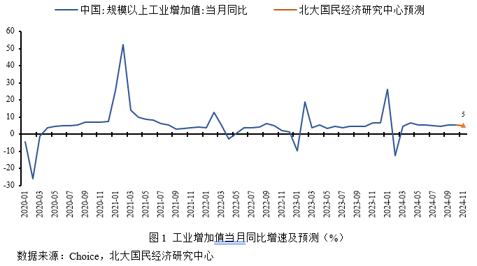 综合而言,新一轮稳增长政策持续出台加大对工业经济增长的支撑力度,制造业景气水平显著提升,工业整体开工率保持合理适度水平,工业经济整体稳定增长,但目前国内有效需求不足并未缓解,叠加企业生产内生动力边际回落以及高基数的不利影响,预计2024年11月工业增加值同比增长5.0%,较上期下降0.3个百分点。