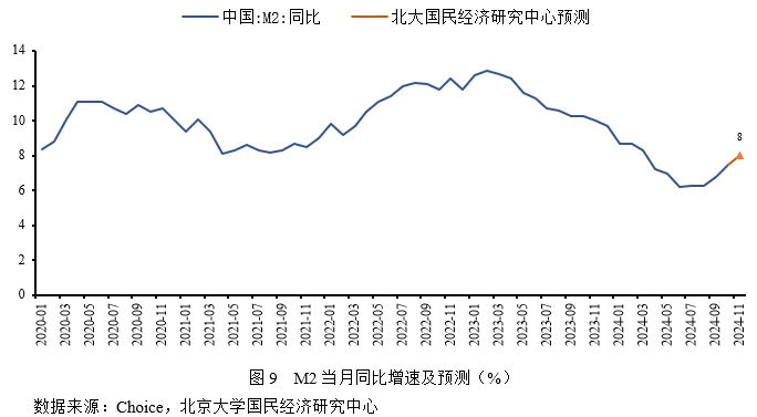 综合而言,新一轮稳增长政策的出台,扩张性货币政策和房地产政策的持续松绑,预防性储蓄也出现减少,有利于信贷规模扩张,而且基数持续下降也将支撑M2同比增速,预计2024年11月末M2同比增长8%,较上期上升0.5个百分点。