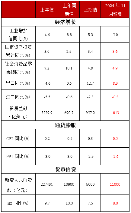 消费:政策推动,乘用车消费上涨明显,消费增速或有上涨,但经济下行压力依然存在,整体经济仍位于底部徘徊,居民收入增速相对不高,叠加高基数效应。预计2024年11月份社会消费品零售总额同比增长4.9%,较10月份上涨0.1个百分点。