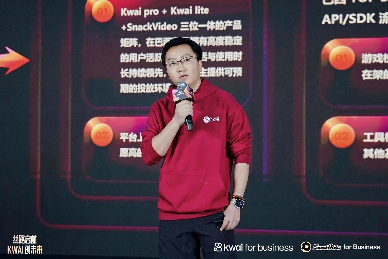 商业化产品围绕“找对流量、做好投放、开拓新局”持续升级,已构建 Kwai Pro + Kwai Lite + SnackVideo 产品矩阵,持续提升用户活跃度与使用时长;并创新推出 WiFi 热点与无网场景变现模式,将广告触达延伸至更多真实用户场景。正如快手国际商业化商业产品负责人廖锐在会上分享,“我们在过去一年也持续深耕和革新核心产品策略,开发智能投放,从‘人工’ 到 ‘AI ’,全面提效降本”,帮助大家 “省成本、提效率”,让投放效果更稳定、转化更精准。未来借助我们的产品能力,在海外市场开拓更大的商业版图,领航商业新程。