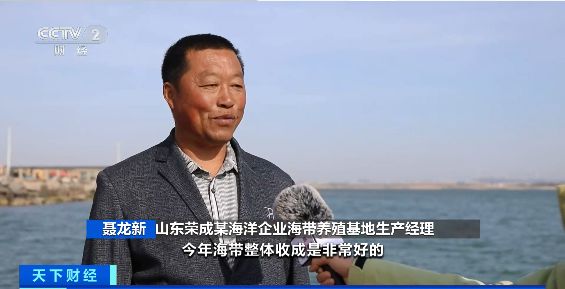 山东荣成某海洋企业海带养殖基地生产经理 聂龙新:今年海带整体收成是非常好的,我们公司海带养殖区有1万亩左右,今年鲜海带预估产量能超过7万吨,今年的产值能突破5000万元。