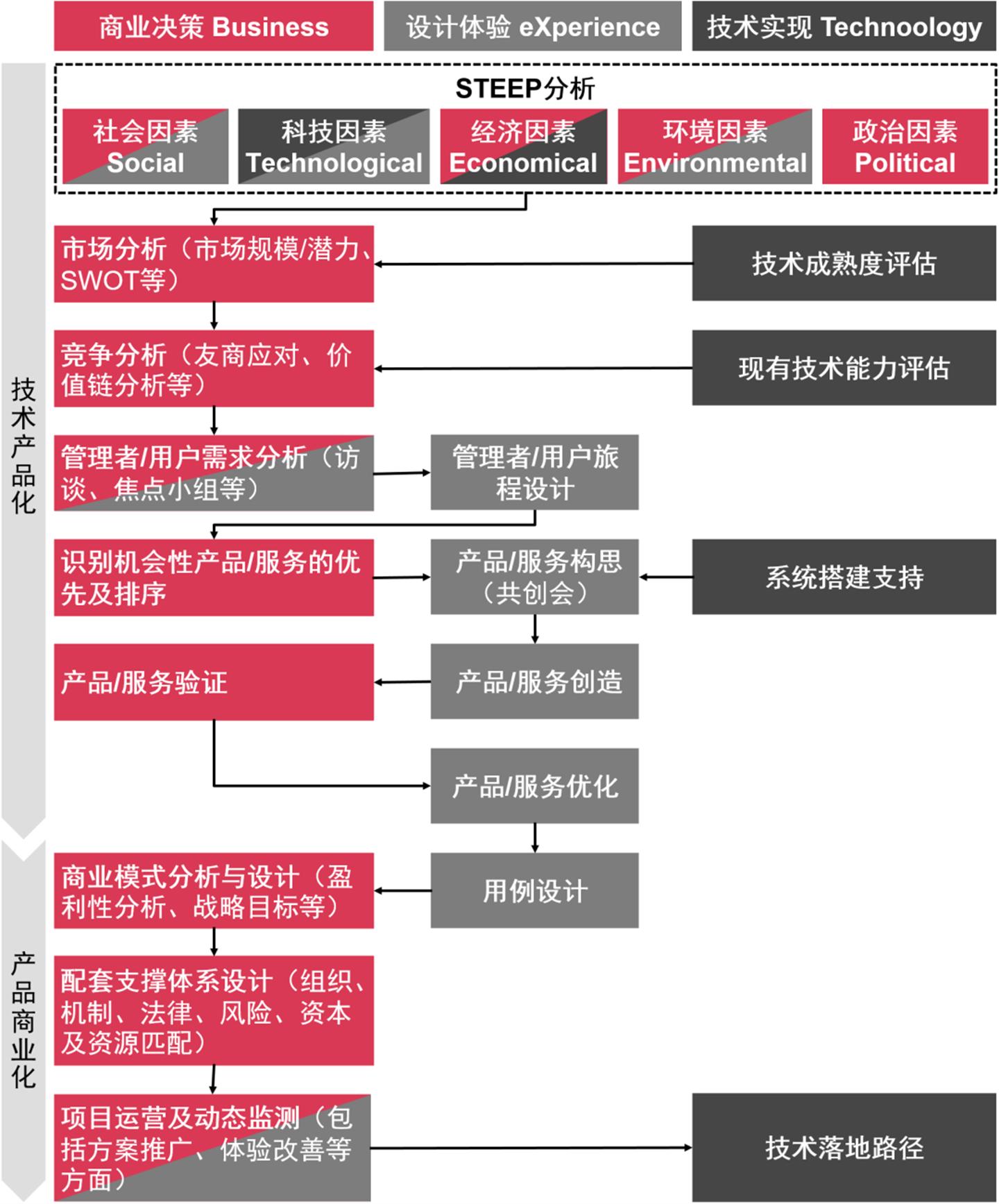 从技术产品化的角度看,基于BXT模型,产品开发需要站在市场需求与客户价值的视角聚焦产出,并通过不断试错和完善迭代发展,最终实现技术能力的复用性和可移植性;而非仅为了应用某个技术的功能特性而设计产品。在总结过往科技创新创业公司失败教训的过程中,一个屡被提起的原因就是“缺少需求分析就贸然开发产品”。