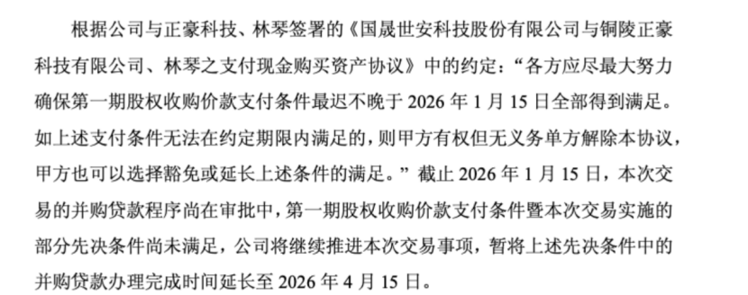 2026年1月15日,国晟科技还将并购贷款办理完成时间由2026年1月15日延长至2026年4月15日。