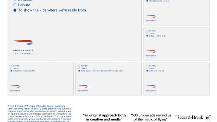 打破记录的515个独特公告牌和海报展示了英国人坐飞机的原因。每一条都关于为什么英国人会在飞机上预订一个位置。这些展示依据位置不同、户外媒体类型不同、观众不同而各有不同。稿件会依据当天的时间、天气、当地及全国的新闻进行调整。数字和静态展示都经过精心挑选,确保观众不会看到同一条原因两次,每条原因都是原创的。这个活动在英国所有主要城市进行了一个月的巡回。