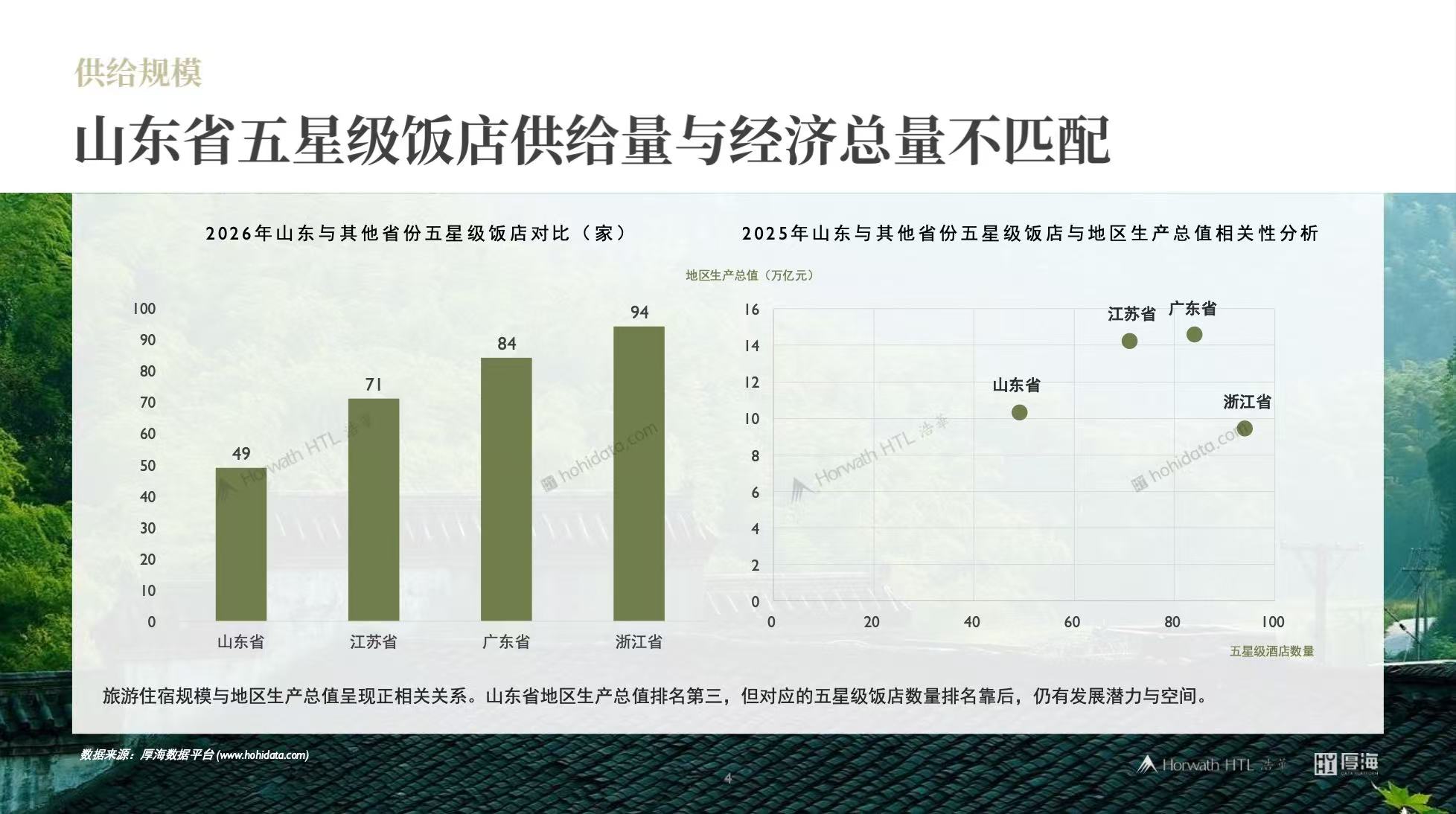 “目前,山东旅游住宿业正从增量扩张向存量整合转变。旅游住宿规模一般与地方GDP呈正相关关系,山东GDP位列全国第三,但对比广东、江苏、浙江等省份,其五星级饭店数量排名靠后,结构优化上仍有较大发展潜力。”浩华酒店管理顾问公司执行董事、大中华区总经理戴雪英表示。