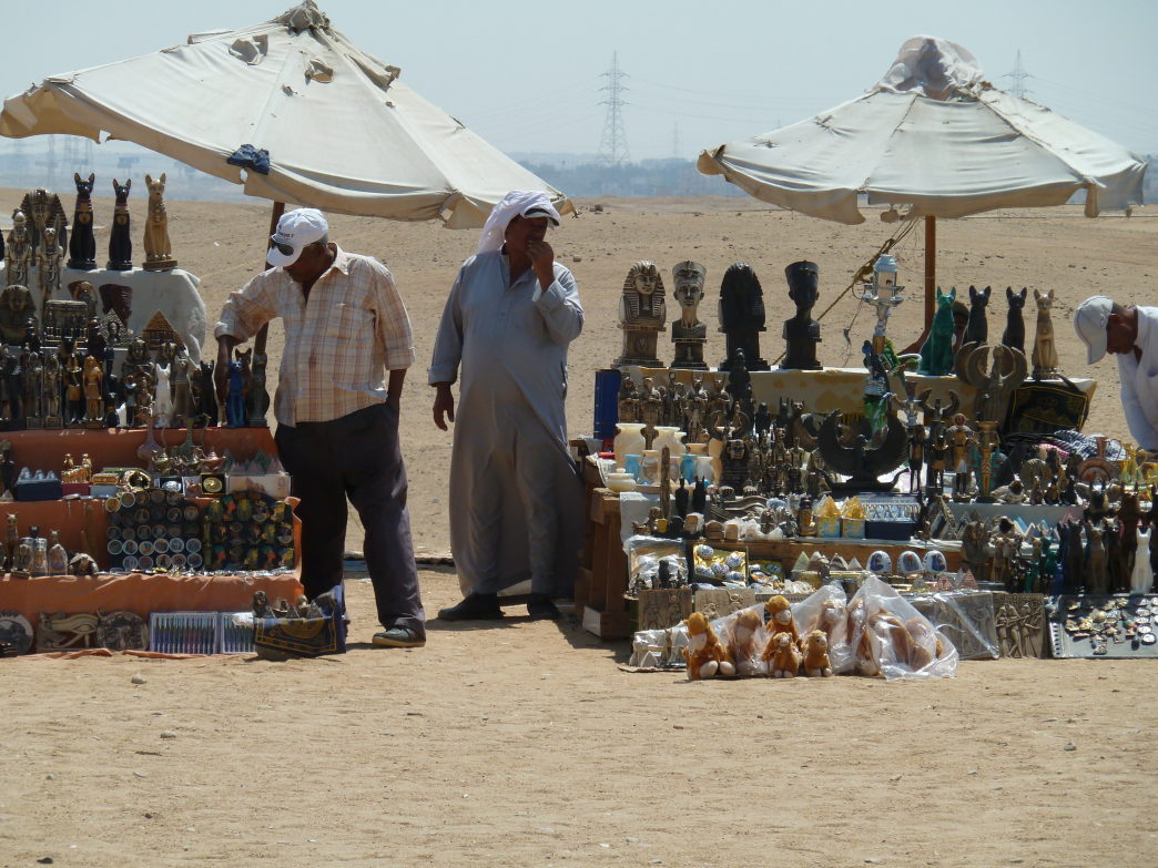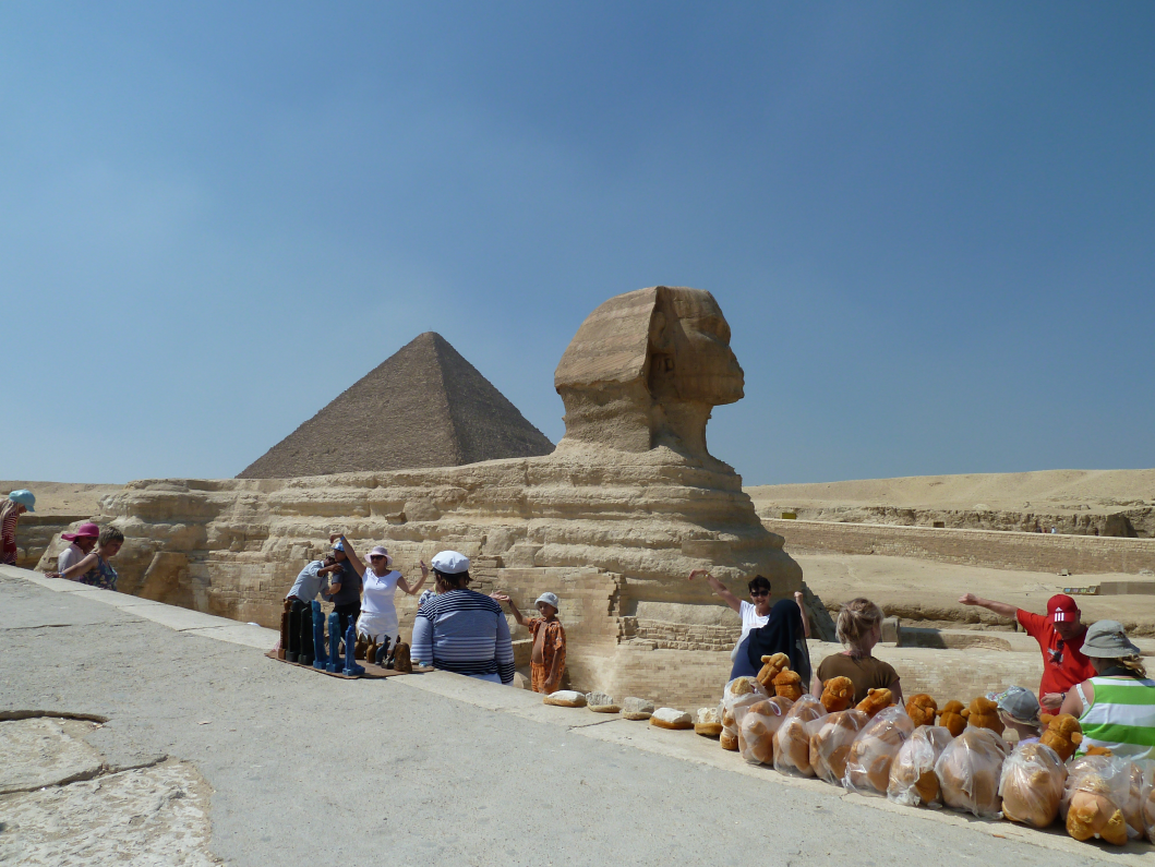 高导游说:埃及九成经济靠运河和旅游。动乱以来,游客骤减,靠旅游吃饭的老百姓活不下去了,只能在景区里缠着游客卖纪念品。那几个围着我们喊“one dollar”的孩子,用汉语、日语、韩语从一数到十,拽着我们的衣角往口袋里塞东西,强行让游客付钱。牵骆驼的人让你免费骑上去,如果不给够钱你就别想下来;警察站在旁边,不但不管,自己也伸手要小费。