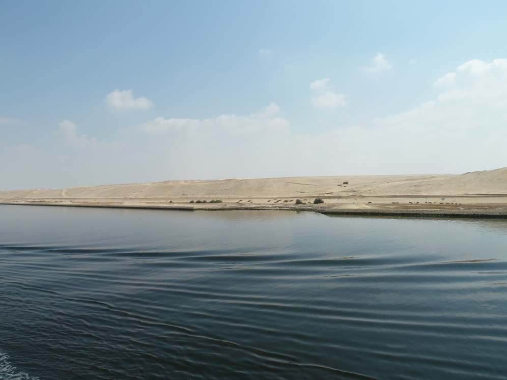 我跑上顶层甲板,那里已经站满了人,每个人都举着相机,每个人都沉默。苏伊士运河就在脚下,不过二三百米宽,像一把刀,将非洲与亚洲利落地切开。船行得很慢,慢到可以看清岸上每一块石头的纹理,慢到可以听见河水轻轻拍打船舷的声音。这缓慢是因为运河水浅,浪大会损坏堤岸,每年数以万计的船只从这里经过,每一艘都是这样小心翼翼地谦卑地滑过,像信徒进入圣地。