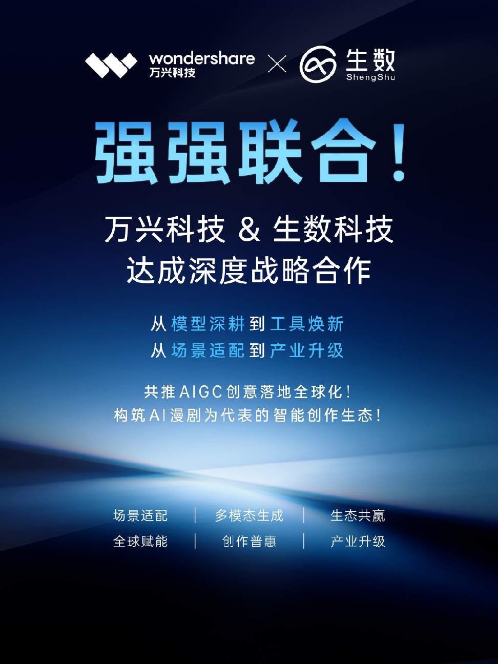 继推出万兴剧厂、千万级投资爆款漫剧制作厂商灵漫快创后,2月5日,AIGC软件A股上市公司万兴科技(300624.SZ)对外宣布加码其AI漫剧战略,斥资数千万元战略投资专注于多模态通用大模型研发的人工智能企业生数科技,同时双方正式达成战略合作,将进行“大模型+工具+场景”的生态级共创,打造AI漫剧工业化生产新范式。双方在深圳举办战略投资合作签约仪式,万兴科技董事长吴太兵、生数科技CEO骆怡航等双方核心高层共同出席和见证。
