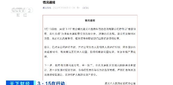 经济观察网 据央视财经消息,“3·15”晚会曝光了一类危害股民权益的“荐股分成”骗局,不法分子冒用私募机构名义,以虚构掌握股市内幕消息的噱头,诱导目标股民买入指定股票,并以“盈利五五分成”非法牟利,严重扰乱资本市场秩序。