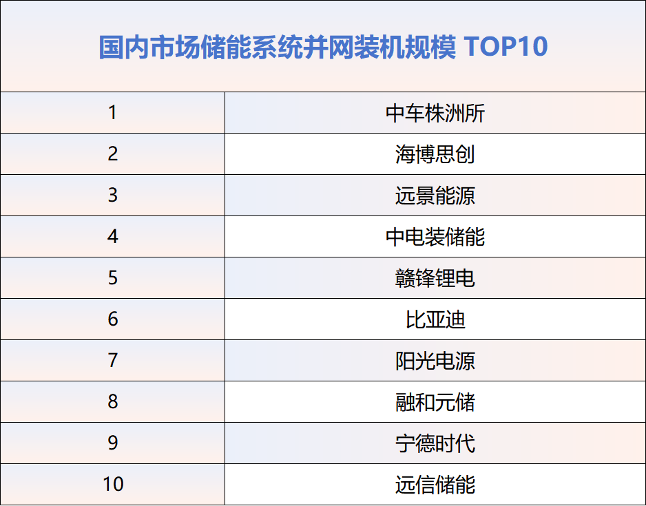 2025年度国内市场储能系统并网装机规模TOP10中国企业,依次为:中车株洲所、海博思创、远景能源、中电装储能、赣锋锂电、比亚迪、阳光电源、融和元储、宁德时代、远信储能。与2024年对比,中车株洲所与海博思创保持前二。远景能源排名从第五升至第三,阳光电源排名从第三下滑至第七。电工时代、新源智储、金风零碳、采日能源跌出榜单,中电装储能、赣锋锂电、宁德时代、远信储能新晋入榜。