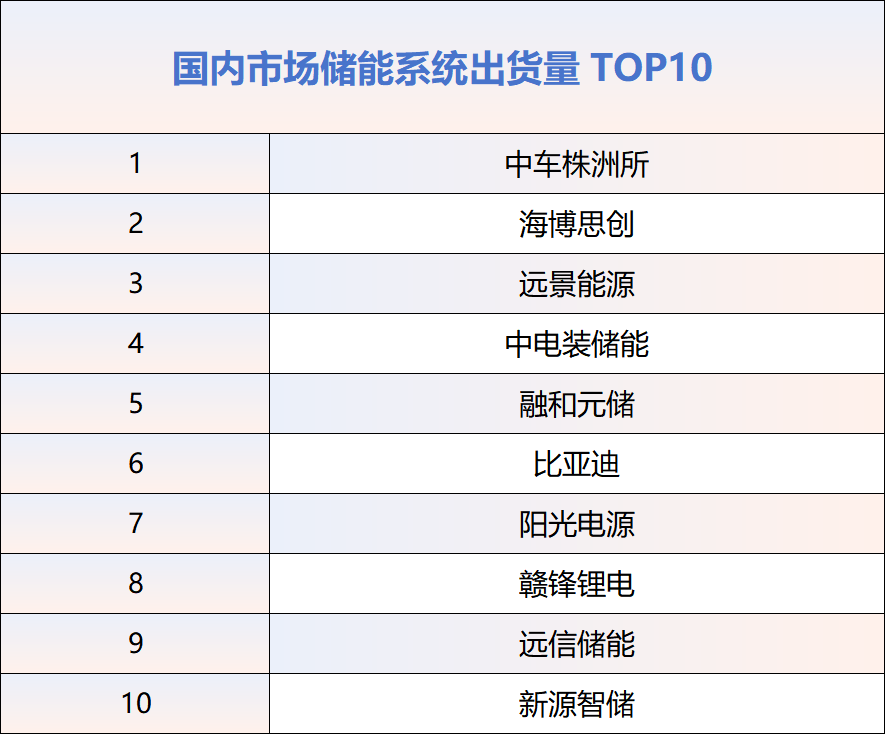 2025年度国内市场储能系统出货量TOP10中国企业,依次为:中车株洲所、海博思创、远景能源、中电装储能、融和元储、比亚迪、阳光电源、赣锋锂电、远信储能、新源智储。与2024年对比,阳光电源下滑显著,由第二滑落至第七,融和元储由第七升至第五,中电装储能、赣锋锂电、远信储能表现突出,新晋入榜。新源智储在出货量榜单中守住了第十名的位置。