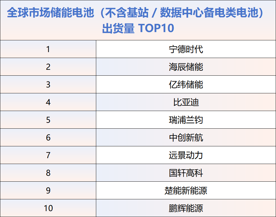 2025年度全球市场储能电池(不含基站/数据中心备电类电池)出货量TOP10中国企业,依次为:宁德时代、海辰储能、亿纬储能、比亚迪、瑞浦兰钧、中创新航、远景动力、国轩高科、楚能新能源、鹏辉能源。与2024年对比,海辰储能超越亿纬储能,排名从第三升至第二。力神与赣锋锂电跌出前十榜单,被国轩高科和鹏辉能源取代。