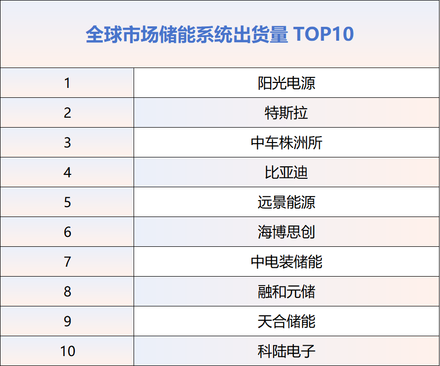 2025年度全球市场储能系统出货量TOP10企业,依次为:阳光电源、特斯拉、中车株洲所、比亚迪、远景能源、海博思创、中电装储能、融和元储、天合储能、科陆电子。