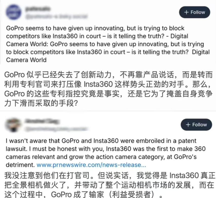 337调查结果出炉后,在美国社交媒体Reddit、X上,有网友直言“GoPro像个爱哭的宝宝(whining like a baby)”,认为其不专注于提升产品,而是试图通过法律手段阻碍创新;多数科技博主将此结果称为“创新者的胜利”,认为影石的App编辑体验和防抖技术(FlowState)在事实层面已领先于对手,专利诉讼只是GoPro失去市场份额后的“法律战术”。