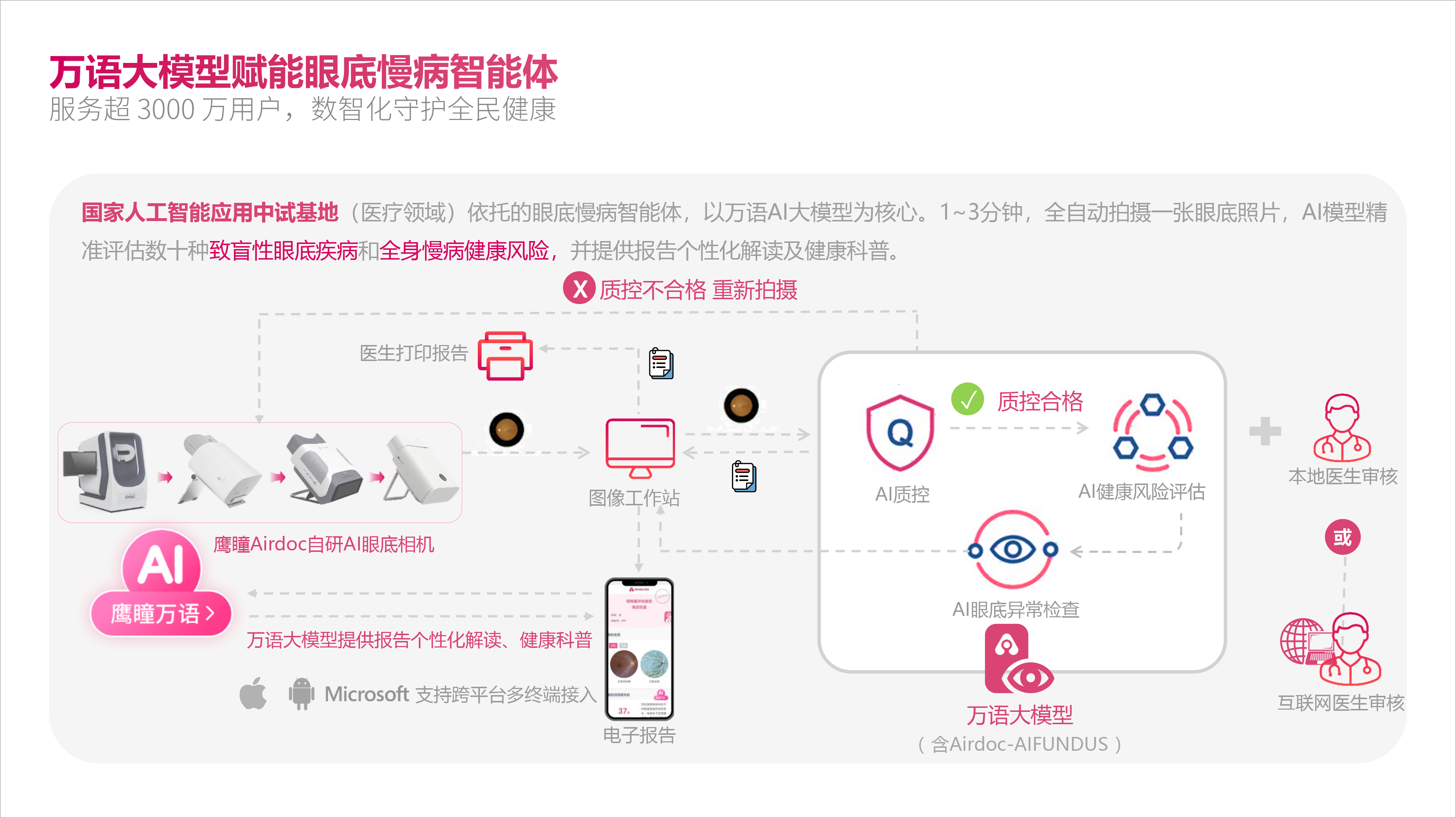 2025年,鹰瞳Airdoc以自研万语大模型为统一技术底座,构建起三大核心AI产品线:近视防控AI(PBM-AI)、视网膜检测AI(Retina-AI)、抗压能力监测AI(Neuro-AI),形成“一个大模型底座、三大AI产品、多场景落地”的整体业务架构。