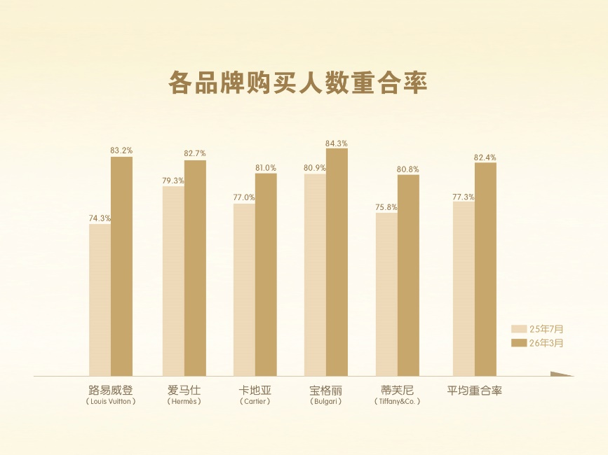 奢侈品消费群体正在加速转向老铺黄金。根据弗若斯特沙利文最新调研数据,老铺黄金消费者与路易威登、爱马仕、卡地亚、宝格丽等国际五大奢侈品牌的消费者平均重合率从2025 年7月的77.3%进一步提升至82.4%。
