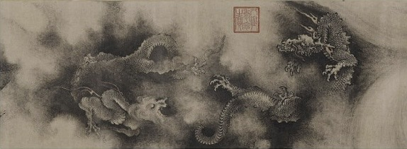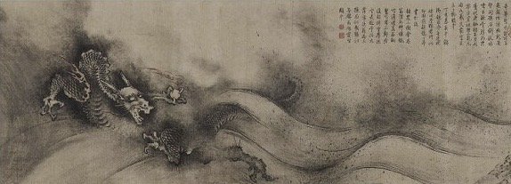 其中南宋画家陈容所画的“水墨龙”最佳,后人称他为“驯龙高手”。代表画作有《六龙图》、《墨龙图》、《九龙图》、《双龙戏海图》等。元代书画鉴赏家汤垕形容其作画过程为“深得变化之意,泼墨成云,噀水成雾,醉余大叫,脱巾濡墨,信手涂抹,然后以笔成之。”相传陈容喜欢酒后乘兴而作,隐约间好似看到真龙一般。