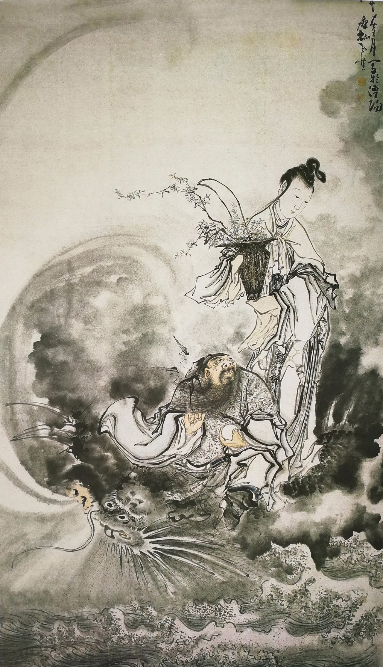 《探珠图》绘制一男子手持宝珠,女子手捧花篮,二人立于一条在巨浪翻腾中的龙上方,黄慎妙笔生花创作出龙口探珠的紧张氛围。
