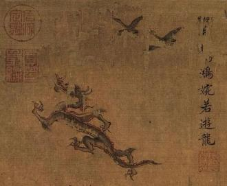 其实,“驭龙”题材并不陌生,上古既有黄帝铸鼎后乘龙升天之说。《史记·封禅》记载:“黄帝采首山铜,铸鼎於荆山下。鼎既成,有龙垂胡髯下迎黄帝。黄帝上骑,群臣後宫从上者七十馀人,龙乃上去。馀小臣不得上,乃悉持龙髯,龙髯拔,堕,堕黄帝之弓。百姓仰望黄帝既上天,乃抱其弓与胡髯号,故后世因名其处曰鼎湖,其弓曰乌号。”百姓仰望黄帝升天,后世将此地称为“鼎湖”,并留下“龙去鼎湖”这一成语,用以形容帝王离世。