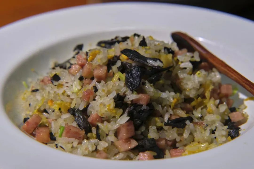 事实上,干巴菌本身的口感并不特殊,鲜味也并不明显,来自油炸的润和脆占据了口腔主要的感观。但它所富含的萜烯类化合物,却能散发出无与伦比的香味,这种混杂了坚果香、花草香、水果香和小麦香气的菌子,在火腿、炒饭的加持下被无限放大。