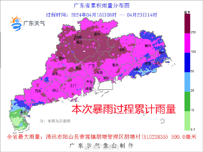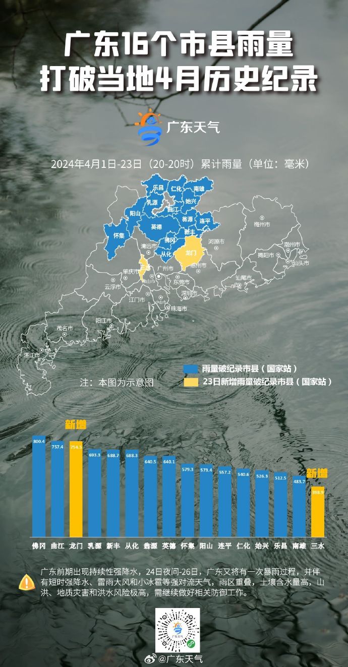 经济观察网讯 据广东省气象服务中心微博“广东天气”4月24日消息,2024年4月1日—23日(20时—20时),佛冈、曲江、龙门、乳源、新丰、从化、翁源、英德、怀集、阳山、连平、仁化、始兴、乐昌、南雄、三水共16个市县国家站累计雨量打破当地4月纪录,其中位于三大暴雨中心之一的佛冈,一共下了800.4毫米,比北京常年平均年雨量还要多200毫米左右。