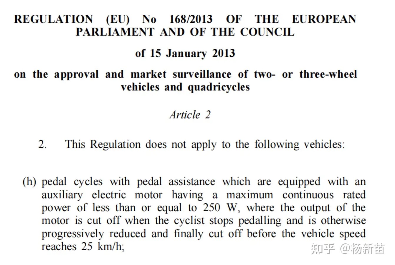 欧盟条例2013第168号是对两三轮车辆和多轮车的车辆型式认证和市场监测。车辆型式认证是管理车辆生产制造的重要工具。该文件的第2条的第2款h项见图1,免除了助力自行车的型式认证。欧盟条例2013第168号延用至今,最近的修订版是2020年。