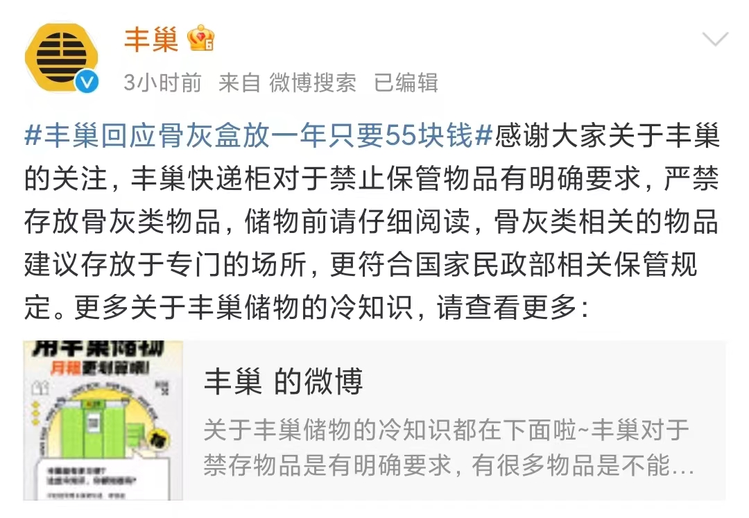 7月23日,针对“丰巢骨灰盒放一年只要55块钱”,丰巢官方微博发文回应称丰巢快递柜对于禁止保管物品有明确要求,严禁存放骨灰类物品,储物前请仔细阅读,骨灰类相关的物品建议存放于专门的场所,更符合国家民政部相关保管规定。