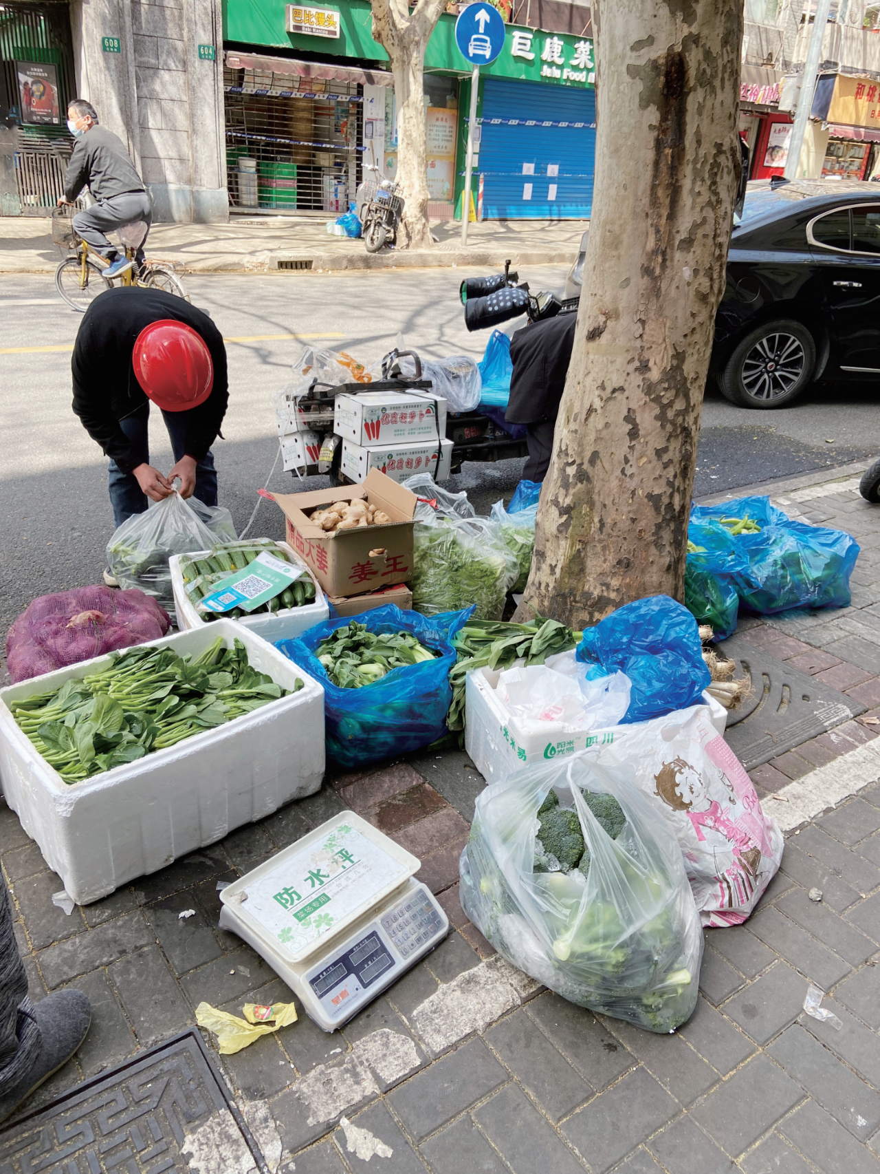 生意是真的好,早上六七点,就七七八八站满了本地阿姨爷叔,衣衫不整,哈欠连天,“两菜两肉”,像黑话一样,感觉你笨拙犹豫举棋不定耽误了供求流水线上的和谐,而爷叔们即使用现金,也比你要麻利很多,准备好的零钱放在边上;再过一阵是上班的白领们,掐着一只菜或者肉馒头和一袋豆奶,扫码离开;再往后松快一点,不时有骑着助动车的蓝色黄色骑手把车停在窨井盖上,拿着三两只包子吃上几口然后扔在脚踏板上面的保温箱上,盯着手机,你是哪哪哪,我马上到马上到……就这样,来来去去一天时间过去。