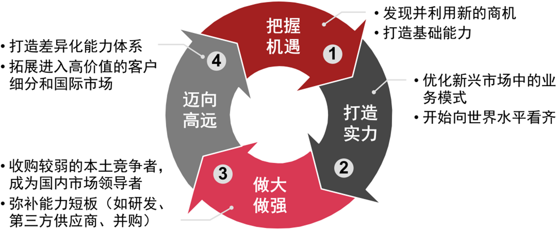 因此对于中国企业来说,无论是国企转型还是民企二次创业,都应把握的一个规律就是中国企业在做大做优做强的过程中一般分四步走:从最初把握机遇到真正打造实力,在包括在中国这样的发展中国家在内的新兴市场中能够独占鳌头,再到做大做强,成为国内市场领导者,最后迈向高远。