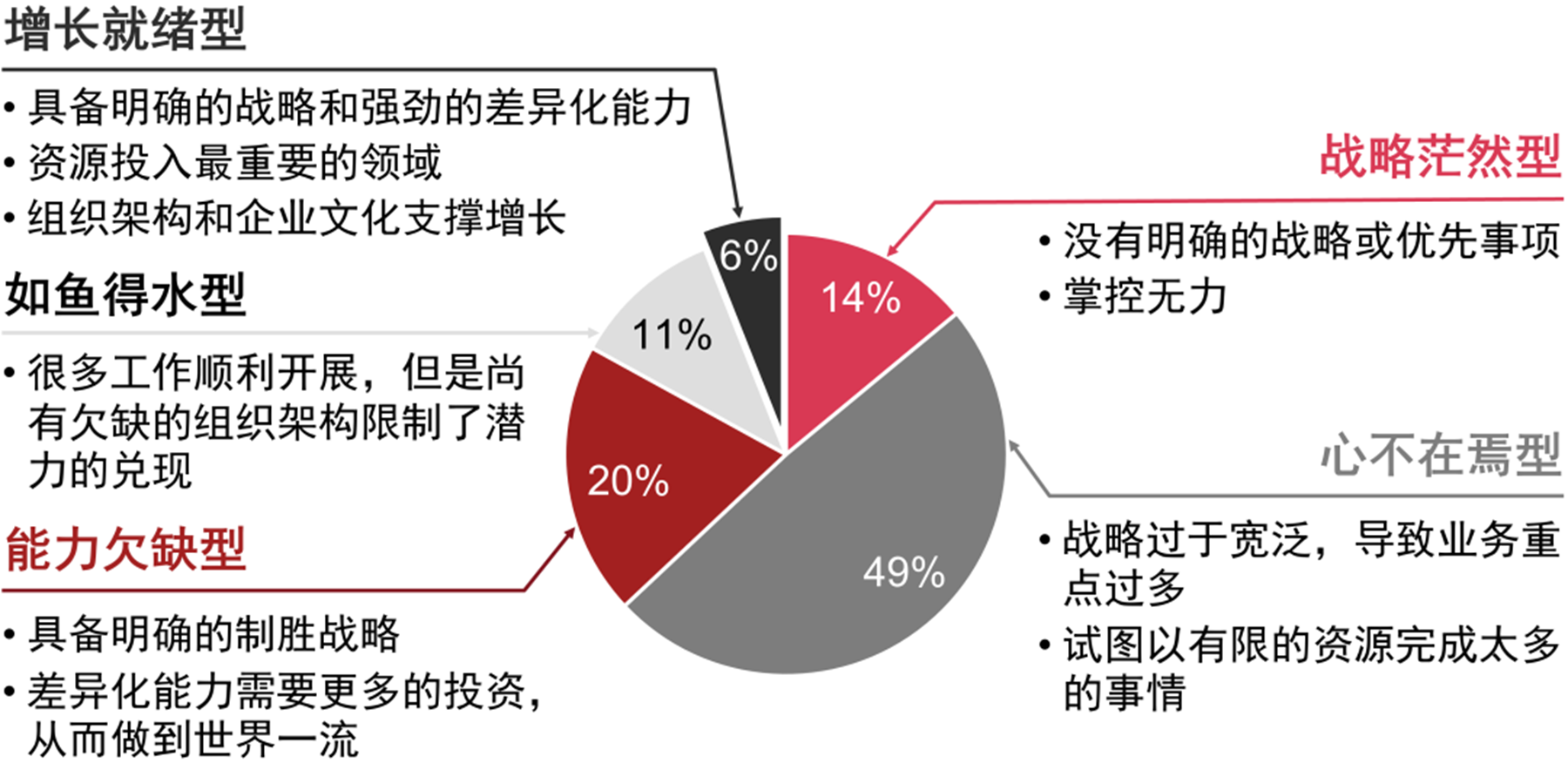 增长对于一家企业而言至关重要。只有通过自身成长和业务的增长才能够给客户和股东带来最大的价值和收益。根据普华永道思略特研究发现:只有6%的企业是增长就绪型。这意味着只有很低比例的企业能够在10-15年的时间范围内获得稳定增长,而40%左右的企业属于“心不在焉”的类型,还有14%的企业属于战略茫然型。所谓战略茫然型企业是指企业没有清晰的战略规划。它们的增长是因为整体的经济环境比较好,一旦经济环境收紧,这类企业的增长也会随之受限。