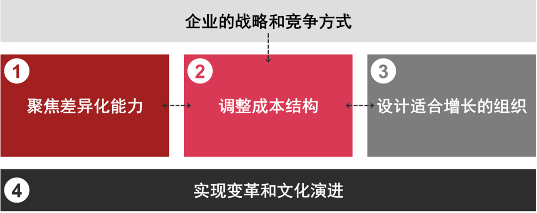所以在企业的战略之下,要着力打造差异化的能力,围绕这些能力调整成本,设计适合增长的组织,然后从文化来支撑这几个方面。在中国实践这套方法还必须考虑中国的国情,并进行针对性地调整,比如成本结构的调整。在中国,较多服务跟资产和业务的优化相关,并不是一个简单的成本结构问题,因此需要优化业务线,或将资产变现。