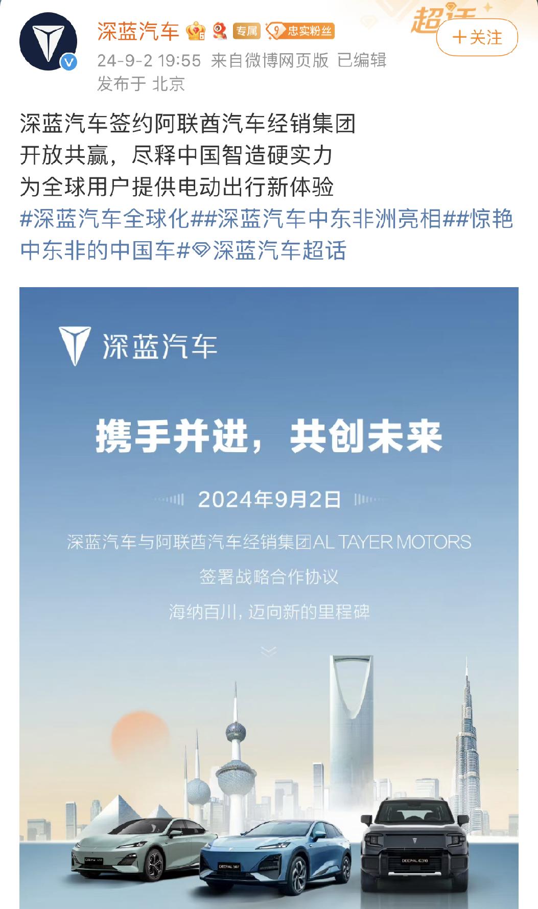 2024年9月2日,深蓝汽车与阿联酋汽车经销集团AL TAYER MOTORS签署战略合作协议。